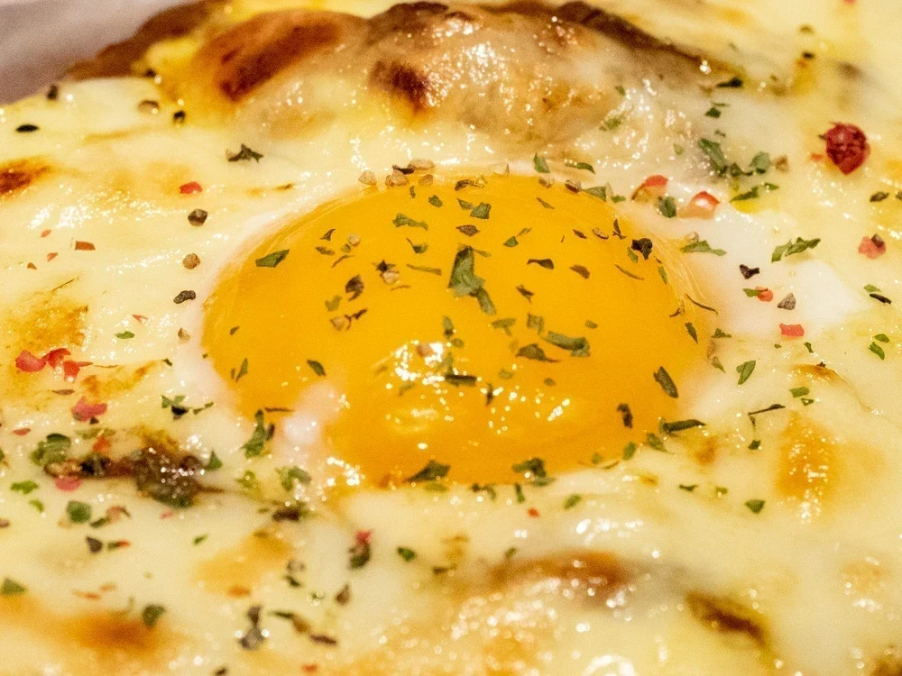 ▼一面をトロッとしたチーズが覆い、中央には玉子の黄身。